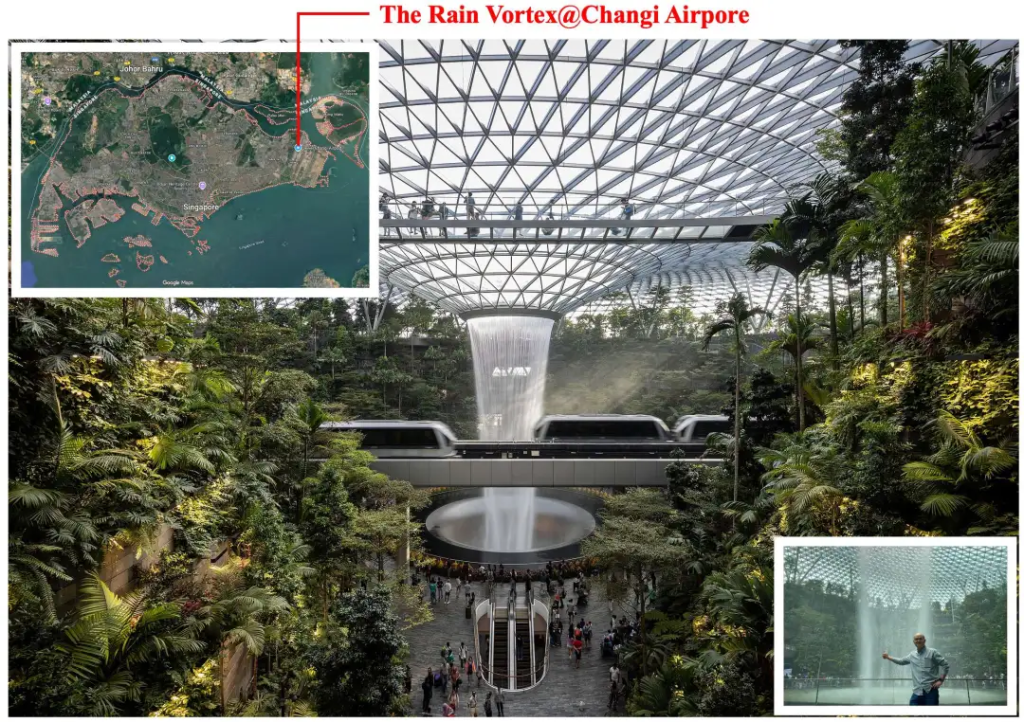 一到新加坡樟宜机场(Changi Airport)就可以看到一个精心设计的壮观“室内瀑布”(the Rain Vortex):