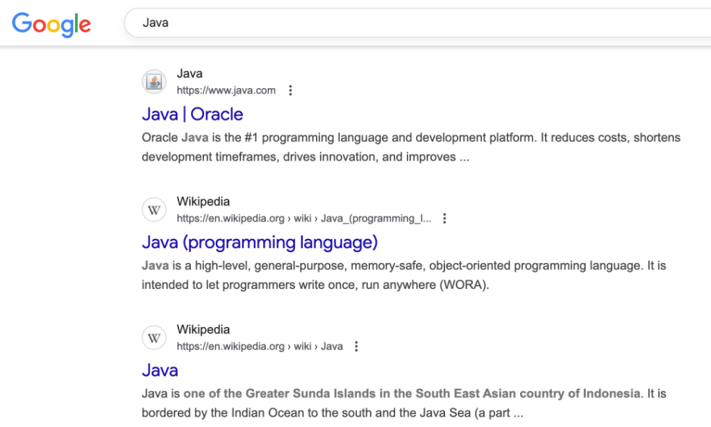 Java 真的是一个岛,而且非常大。Java 岛是印尼人口最多的岛,也是印尼首都雅加达所在的地方。但如果在 Google 上搜索“Java”会发现,这个词已经被编程语言所占据,真正的“Java岛”的搜索结果只在第三,并且,整个第一页,只有这一个结果是与Java岛相关的。