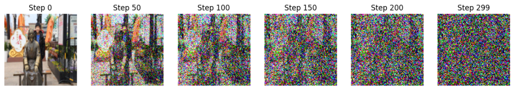 例如,我们使用论文 DDPM 中的设定对如下图片添加噪声,就可以观察到如下过程: